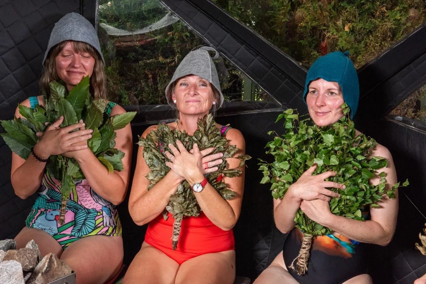 SaunaPause community members sharing warmth in the sauna with leafy whisks.